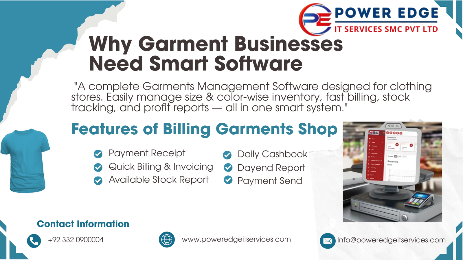 In today’s competitive garment industry, managing a clothing business efficiently requires more than just traditional methods. Power Edge IT Services offers a complete, smart, and integrated garments billing solution designed to meet the unique needs of retail and wholesale clothing stores. Our software is not just a tool—it is a comprehensive platform that empowers business owners to streamline daily operations, reduce errors, and make data-driven decisions with ease. By automating routine administrative tasks, shop owners can save valuable time and focus on expanding their business, enhancing customer satisfaction, and maximizing profitability.