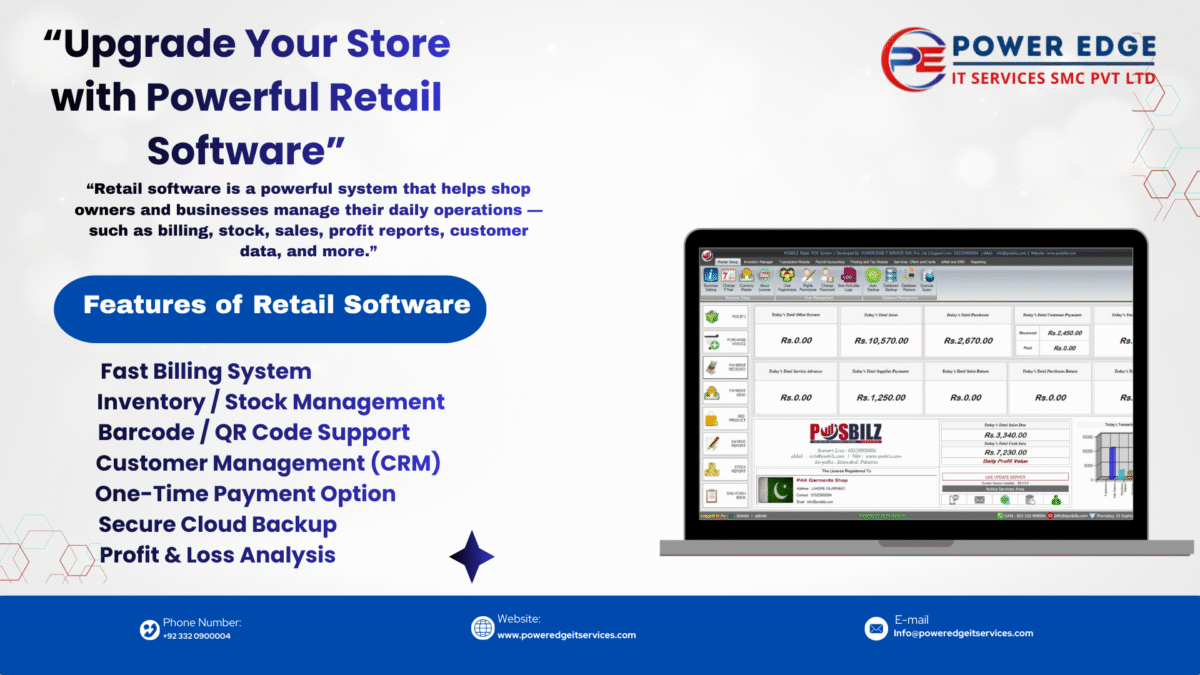 December 1, 2025Retail software is a modern and intelligent business management system designed to handle the complete operations of any retail store with speed, accuracy, and efficiency. In today’s fast-moving retail market, manual work creates delays, errors, and mismanagement — but retail software transforms this entire process into a smooth, automated workflow. Whether you own a grocery store, garment shop, cosmetics outlet, mini-mart, mobile accessories shop, or electronics store, this software helps you manage every part of your business from a single, easy-to-use platform. It streamlines billing, tracks inventory in real time, maintains customer records, monitors suppliers, and generates detailed sales reports, making your business more professional and organized.